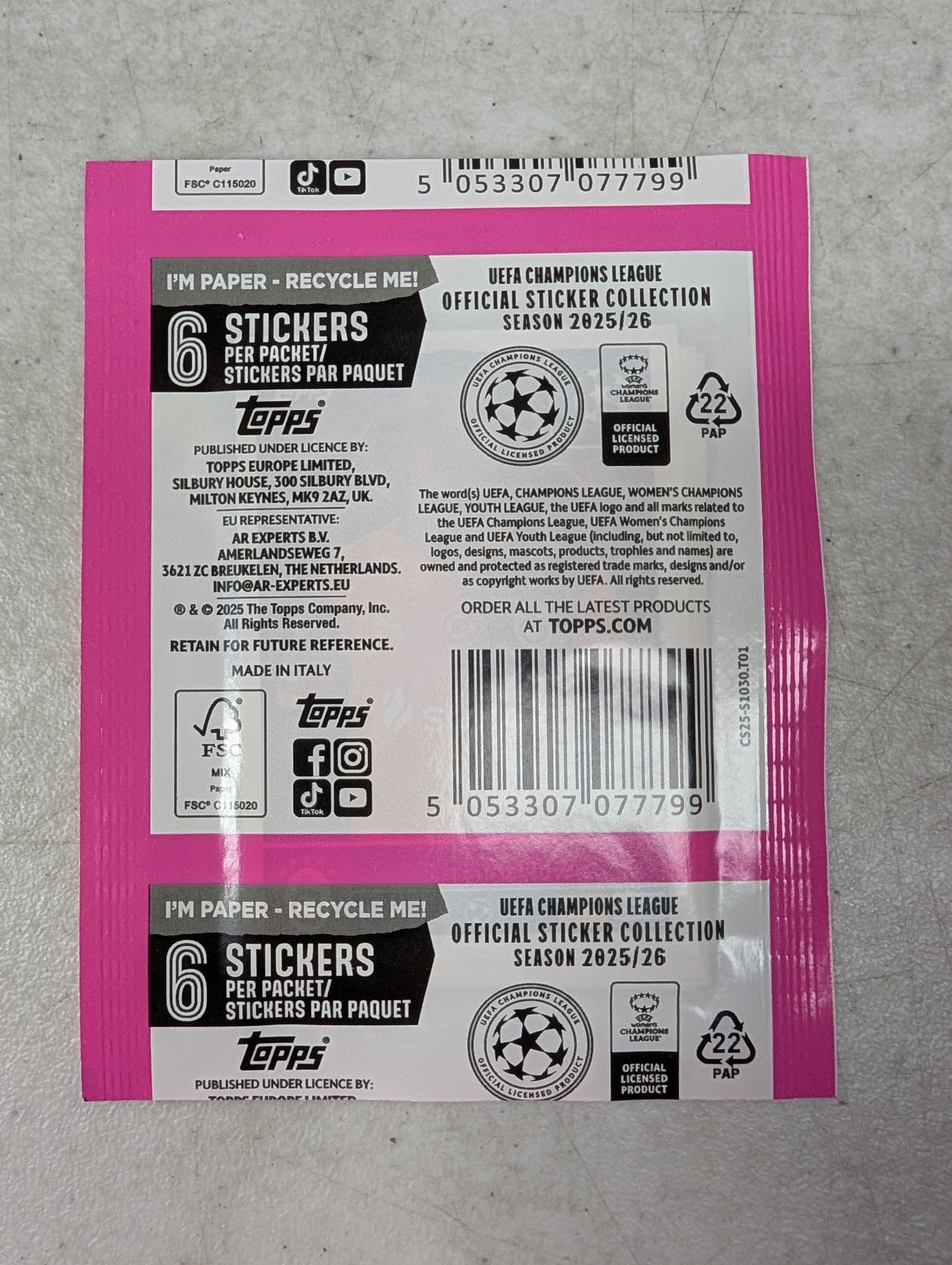 Collect the stars of European soccer with 2025-26 Topps UEFA Champions League sticker packs! Each pack delivers six stickers featuring your favorite teams and players competing for glory. Perfect for building your complete collection, trading with friends, or decorating your gear. Whether you're a die-hard fan or just getting started, these stickers capture all the excitement of the world's most prestigious club competition. Rip a pack and see who you pull!