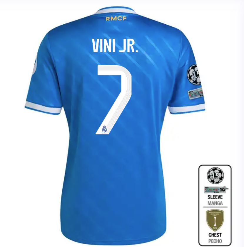 Show your support for Real Madrid with the UCL Men's 3rd Jersey 2025/26 in blue, featuring Vini Jr.'s iconic #7. Designed for comfort and style, this kit lets you celebrate every match with passion and pride. Perfect for fans who want to wear their team spirit on and off the pitch.